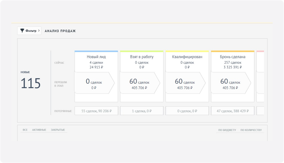 С помощью отчетов можно отслеживать динамику продаж, определять наиболее эффективные каналы привлечения клиентов, анализировать конверсию воронок, оценивать производительность вашей команды.