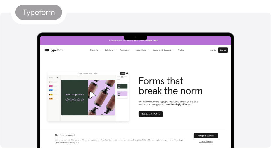 От $34 за базовый пакет до $74 за лицензию Enterprise. Для крупного бизнеса компания предлагает индивидуальные тарифные планы, которые зависят от сложности решения. Есть бесплатная версия, но в ней можно собирать не больше 25 ответов в месяц.